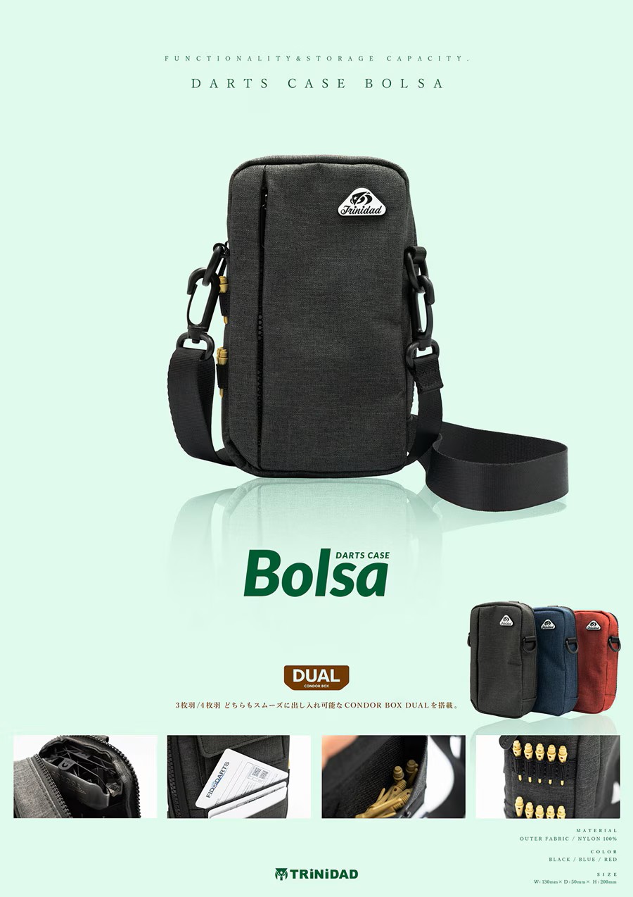TRiNiDAD Darts Case Bolsa 兼具機能性及大容量的鏢包。 [COLOR] BLACK / RED / BLUE [SIZE] W130mm D50mm H200mm [素材] 尼龍00% [附屬品] CONDOR BOX DUAL×1 / CONDOR DUAL BELT×1