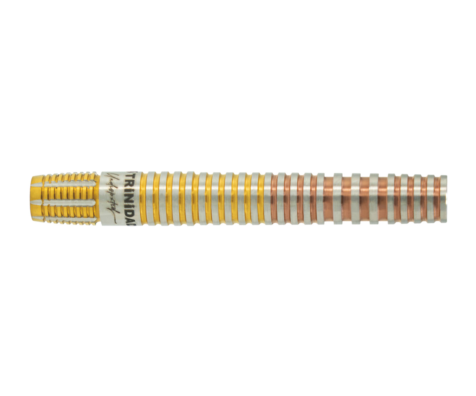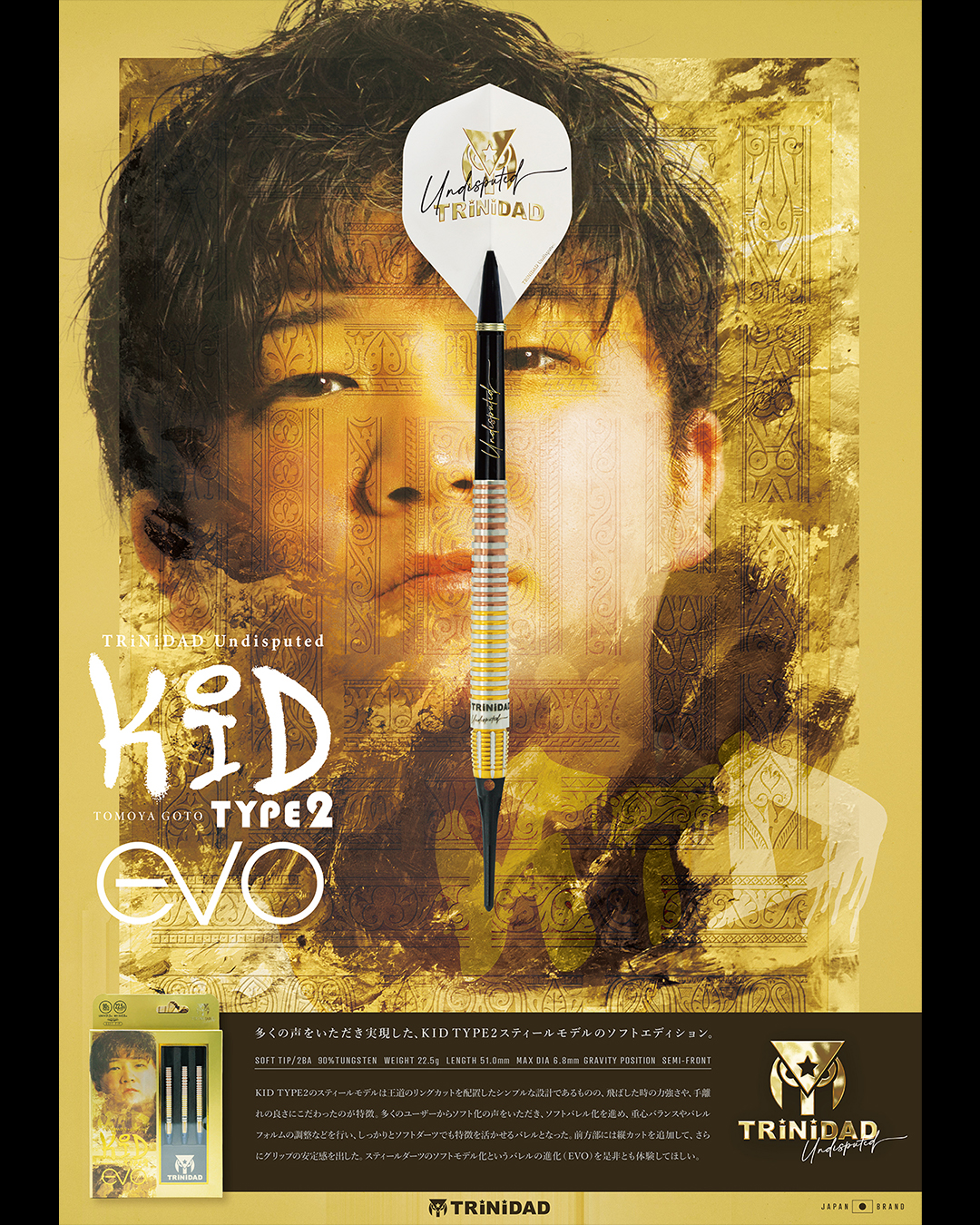 TRiNiDAD Undisputed KID TYPE2 EVO Tomoya Goto Model 多くの声をいただき実現した、KID TYPE2スティールモデルのソフトエディション。 KID TYPE2のスティールモデルは王道のリングカットを配置したシンプルな設計であるものの、飛ばした時の力強さや、手離れの良さにこだわったのが特徴。 多くのユーザーからソフト化の声をいただき、ソフトバレル化を進め、重心バランスやバレルフォルムの調整などを行い、しっかりとソフトダーツでも特徴を活かせるバレルとなった。 前方部には縦カットを追加して、さらにグリップの安定感を出した。 スティールダーツのソフトモデル化というバレルの進化(EVO)を是非とも体験してほしい。 ■スペック 素材:タングステン90% 全長:51.0mm 最大径:6.8mm バレル重量:22.5g