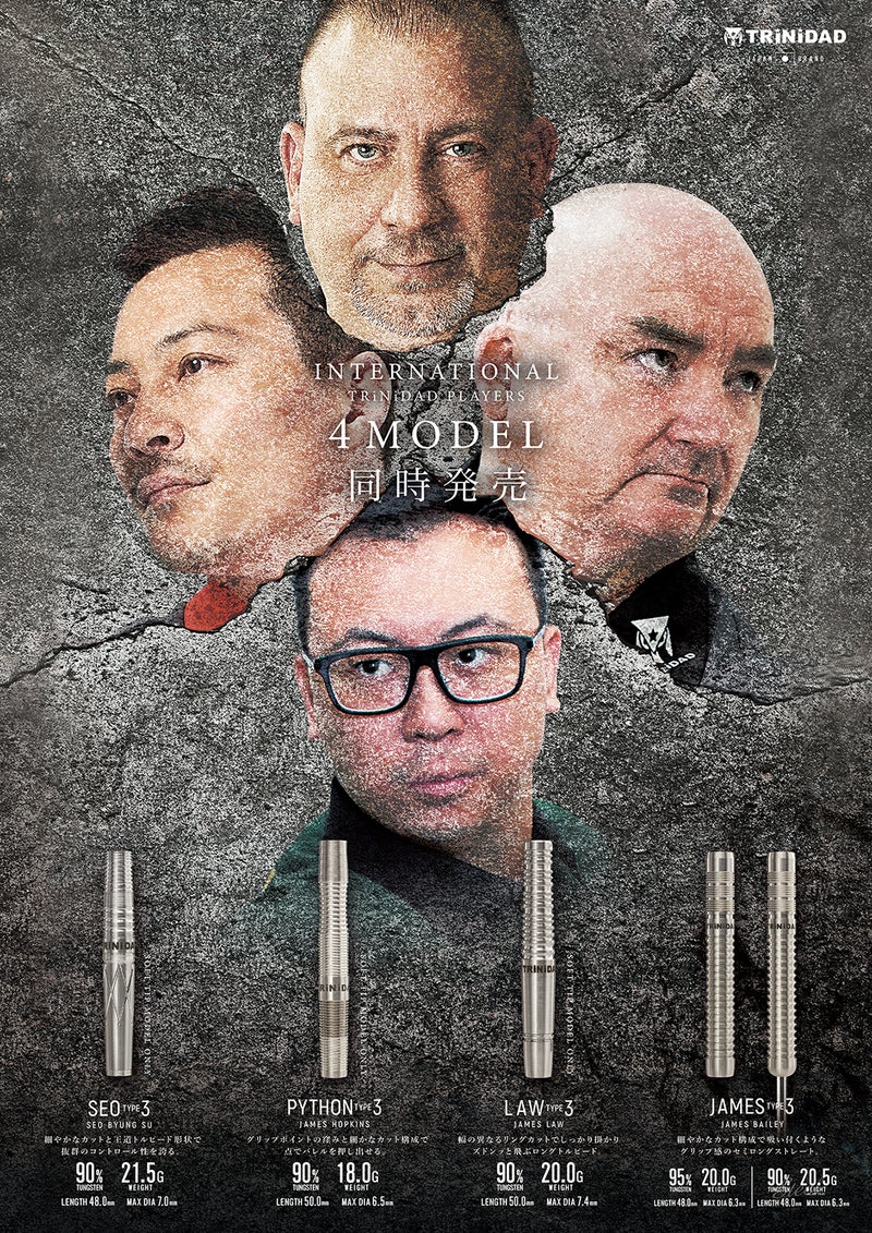 INTERNATIONL TRiNiDAD PLAYERS🌏 4MODEL 同時発売! 🇰🇷🇺🇸🇭🇰🇦🇺 🇰🇷SEO BYUNG SU Model ◤SEO TYPE3◢ 細やかなカットと王道トルピード形状で抜群のコントロール性を誇る。 [SPEC] TUNGSTEN90% Weight:21.5g Length:48.0㎜ MaxDia:7.0㎜ 🇺🇸James Hopkins Model ◤PYTHON TYPE3◢ グリップポジションの窪みと細かなカット構成で、点でバレルを押し出せる。 [SPEC] TUNGSTEN90% Weight:18.0g Length:50.0㎜ MaxDia:6.5㎜ 🇭🇰James Law Model ◤LAW TYPE3◢ 幅の異なるリングカットでしっかり掛かり、ズドンと飛ぶロングトルピード。 [SPEC] TUNGSTEN90% Weight:20.0g Length:50.0㎜ MaxDia:7.4㎜ 🇦🇺James Bailey Model ◤JAMES TYPE3◢ 細やかなカット構成で吸い付くようなグリップ感のセミロングストレート。 [SPEC] ・2BA TUNGSTEN95% Weight:20.0g Length:48.0㎜ MaxDia:6.3㎜